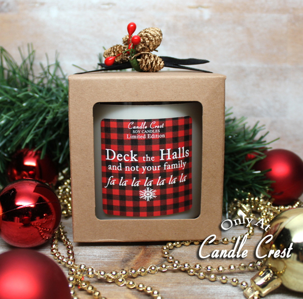 Candle Reads: “Deck the Halls and Not your Family – fa la la la la la la” – This candle is scented with our popular Egg Nog fragrance – Yum!