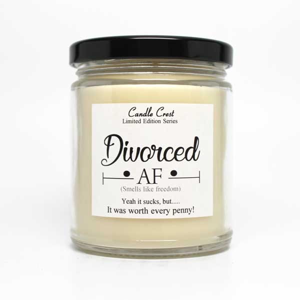 - Candle Reads “Divorced AF {Smells Like Freedom} Yeah it sucks….But it was worth every penny!”