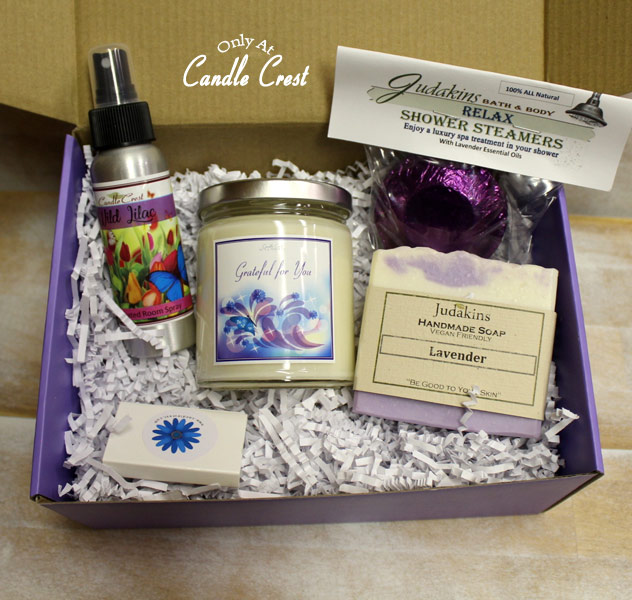 The ‘Grateful’ soy candle is scented with Vanilla Lemon – A warm and uplifting fragrance.  All Bath & Body product fragrances vary – We will hand select the fragrances from our list of best seller. That makes each gift box unique.
